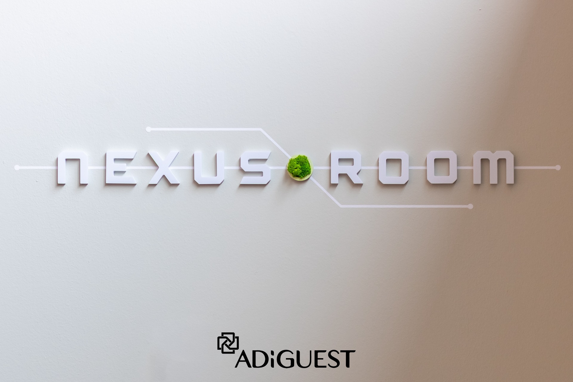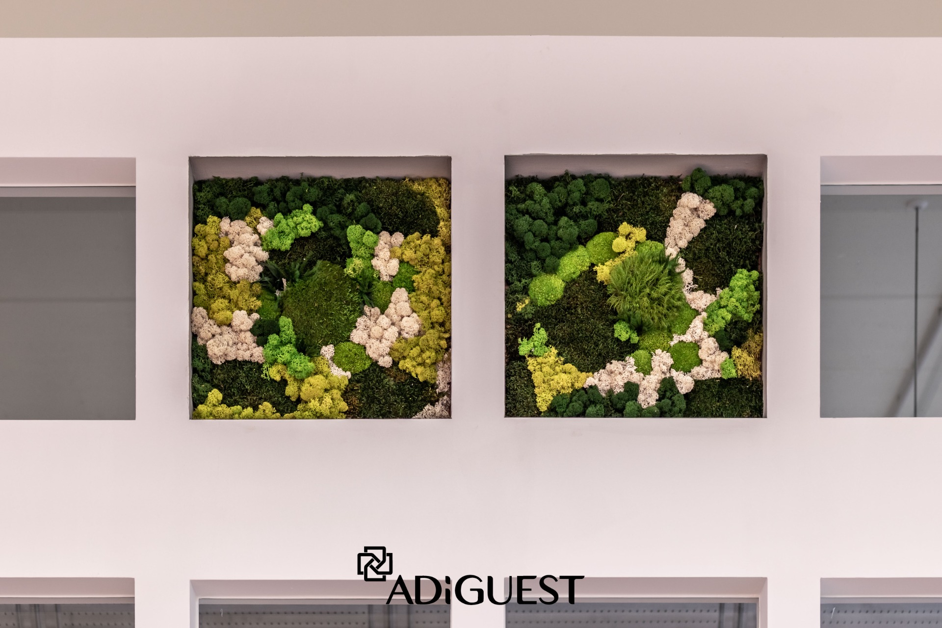 La tinteggiatura verde del soffitto è stata preservata ed estesa ad alcune porzioni di pareti per definire un volume, al cui interno sono stati inseriti elementi vegetali in lichene stabilizzato. L'aspetto multinazionale e di connessione in rete è stato sottolineato attraverso la scelta di una grafica in laminato adesivo (interior wrapping) che rappresenta il planisfero e i suoi collegamenti. L'acustica dell'ambiente è migliorata con l'impiego di appositi pannelli, recuperati e rivestiti con tessuti nelle tonalità del grigio e del verde.