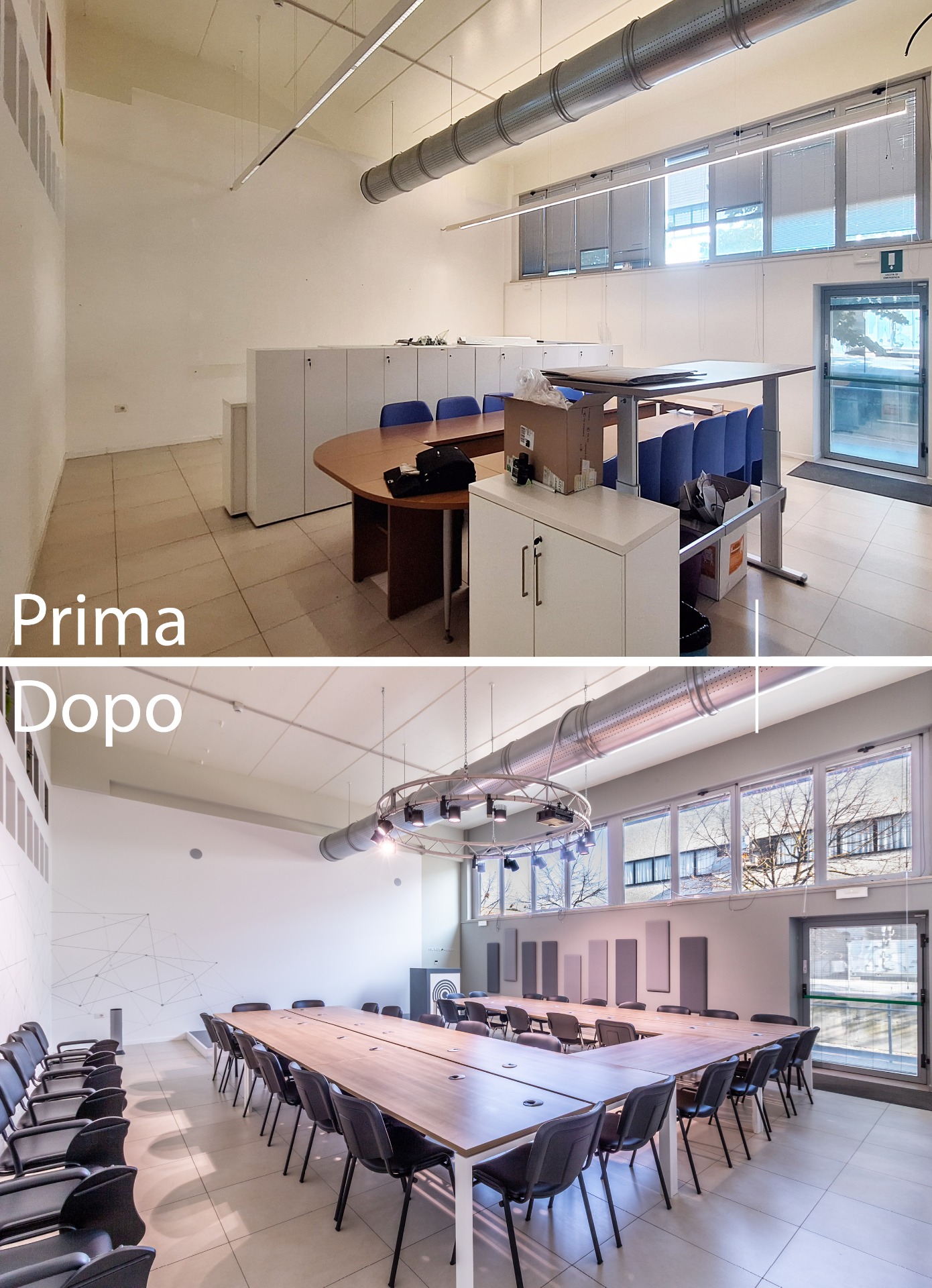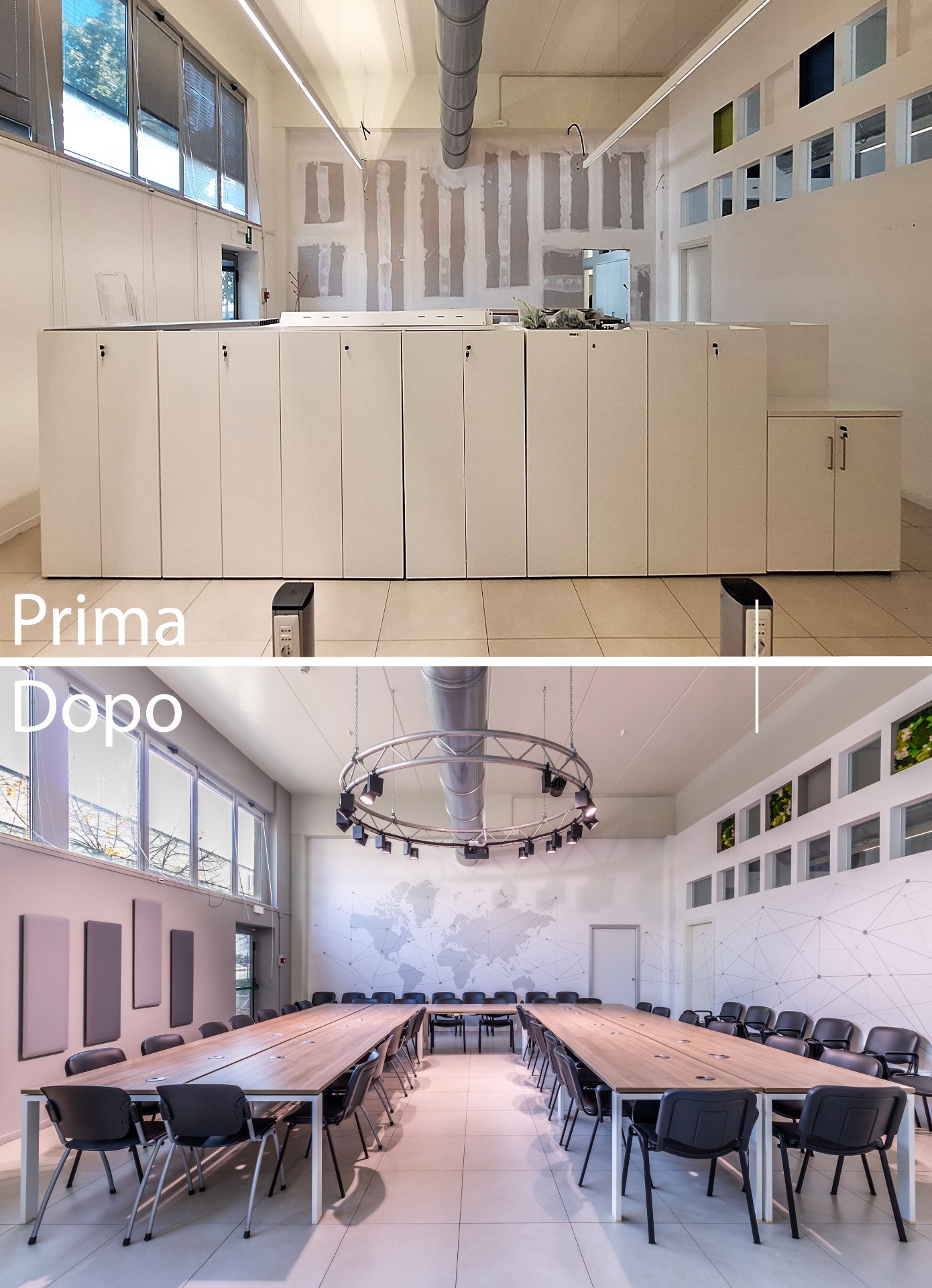 L'obiettivo dell'incarico era quello di allestire uno spazio flessibile per formazione ed eventi, rispecchiando l'immagine visiva del brand con effetto WOW, in pochissimi giorni senza interruzione dell'attività.